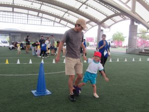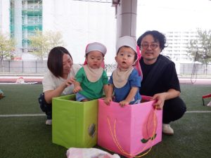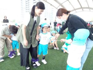 その後は、3歳以上児クラスは、親子で「3クラス対抗二人三脚!」