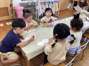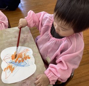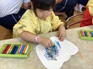 今月の製作では、クレヨンと絵の具を使って自由にかぼちゃにぬりぬり🎨🖌