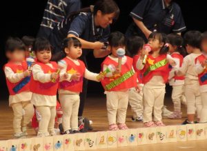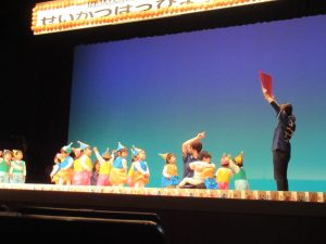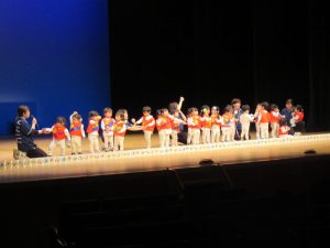 11月の発表会では、大きなステージでリトミックと楽器遊びに加えて、