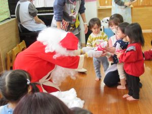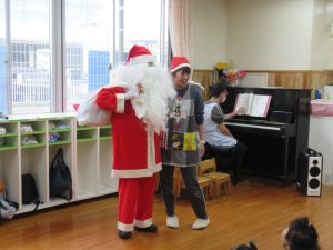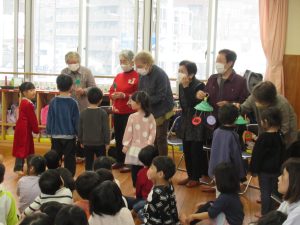 12月24日は、地域の長寿会の方々を招いて、誕生会とクリスマス会を行いました。