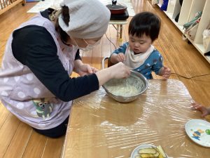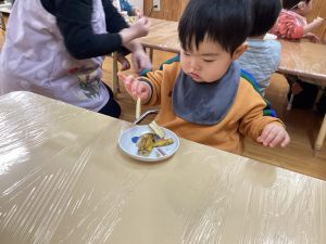 今日は、栄養士の先生と『バナナの皮むき🍌』&『バナナパンケーキ作り』に挑戦✨