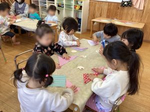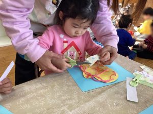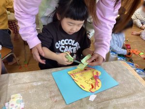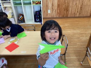 製作活動では、ハサミ✂を使う練習をしたり、折り紙を折ったりして楽しんでいます🎵